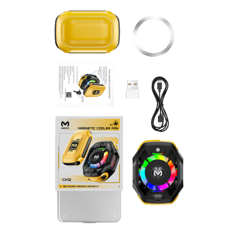 MEMO CX12 : 1 cộng cáp sạc, 1 miếng dán từ tính sò lạnh , 1 đầu chuyển USB to C giúp anh em sạc lại pịn , 1 sách HDSD và hộp đựng sản phẩm.
